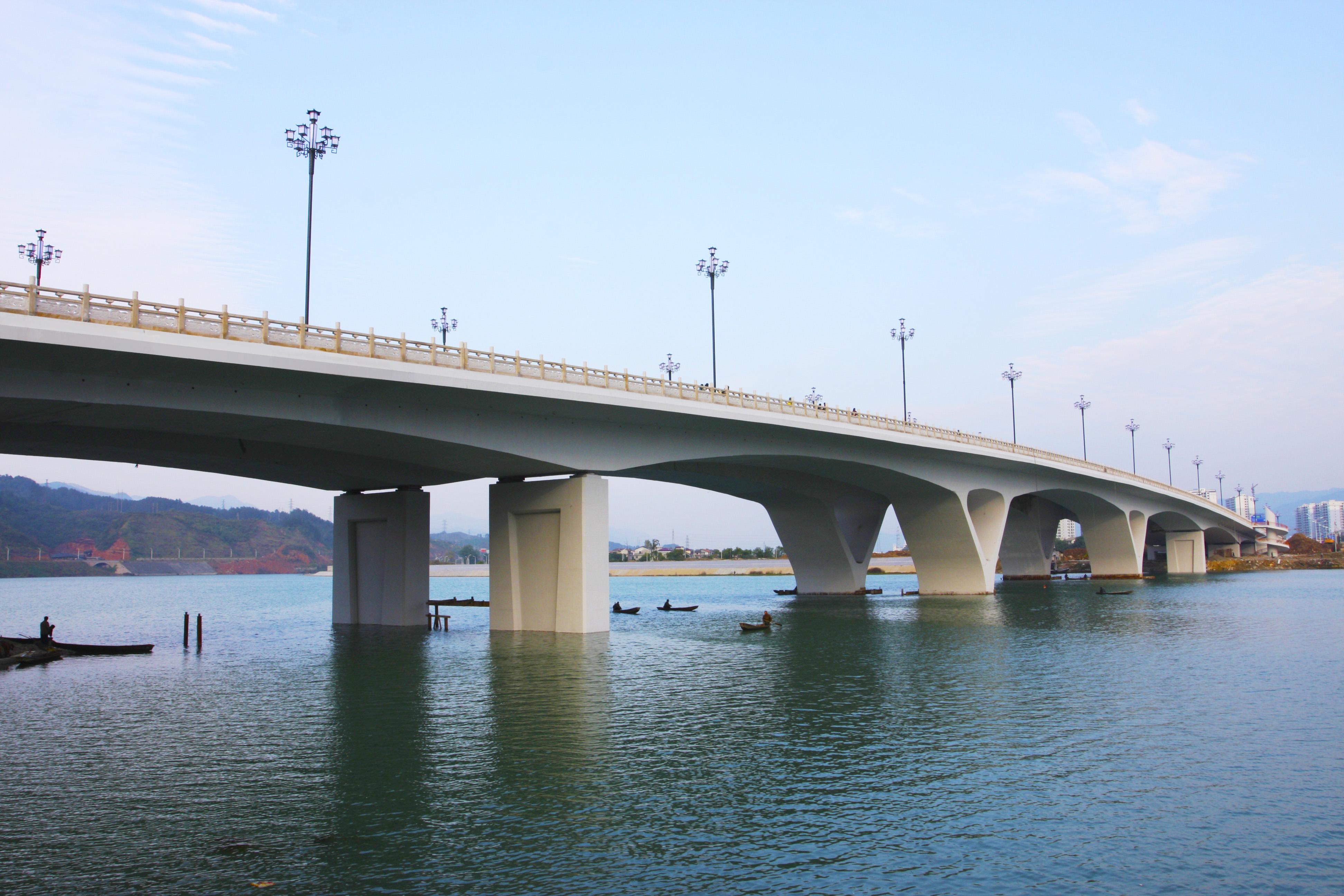 張家界市鸕鶿灣大橋是連接常張高速公路與張家界市區(qū)的重要通道。大橋長425.16m,寬33m,分左右兩幅設(shè)置箱梁,雙向六車道,是張家界市首座預(yù)應(yīng)力混凝土Y型剛構(gòu)-連續(xù)組合箱梁結(jié)構(gòu)。工程合同造價9662.19萬元。工程榮獲“全國市政金杯示范工程獎”。大橋3#、4#橋墩為Y型斜腿板式鋼筋混凝土結(jié)構(gòu),斜腿軸線與墩中心線夾角43.477°,施工過程中采用靠背支架現(xiàn)澆施工方法成功解決了該橋墩曲線多、斷面形狀復(fù)雜的技術(shù)難點。張家界市鸕鶿灣大橋?qū)τ诰徑獬菂^(qū)交通壓力,促進經(jīng)濟和社會的協(xié)調(diào)發(fā)展具有十分重要的意義,是彰顯地方特色文化、增進城市競爭力的重要形象工程,它的建成為張家市取得了很好的經(jīng)濟效益和社會效益。